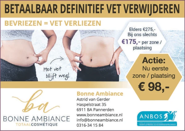 - Nazorg & resultaat - Na de behandeling masseer ik het gebied kort om de afvoer van vetcellen te stimuleren. Je kunt direct je dagelijkse activiteiten hervatten. Het resultaat wordt meestal zichtbaar na de tweede behandeling. Voor optimaal effect wordt een kuur van 3 behandelingen aanbevolen, met tussenpozen van ongeveer 10 weken.